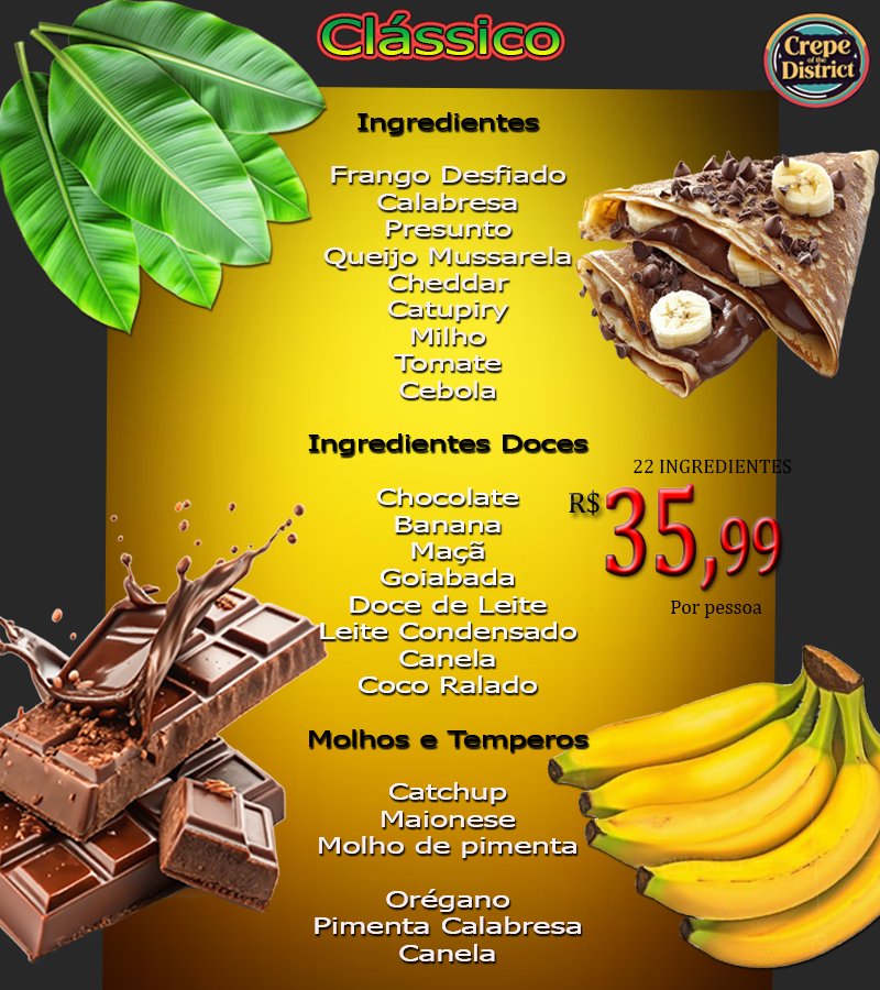 Nossos crepes são preparados na hora com ingredientes frescos e de alta qualidade, resultando em uma massa leve, fina e crocante.